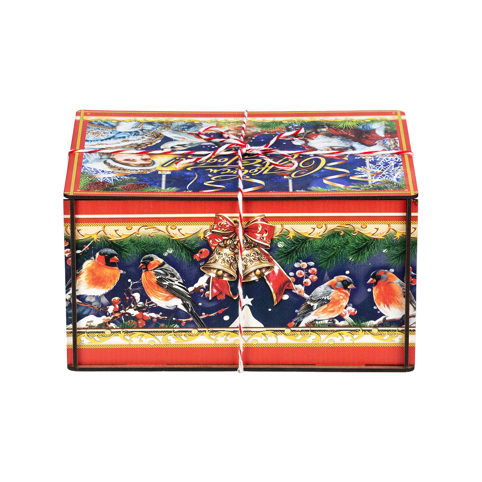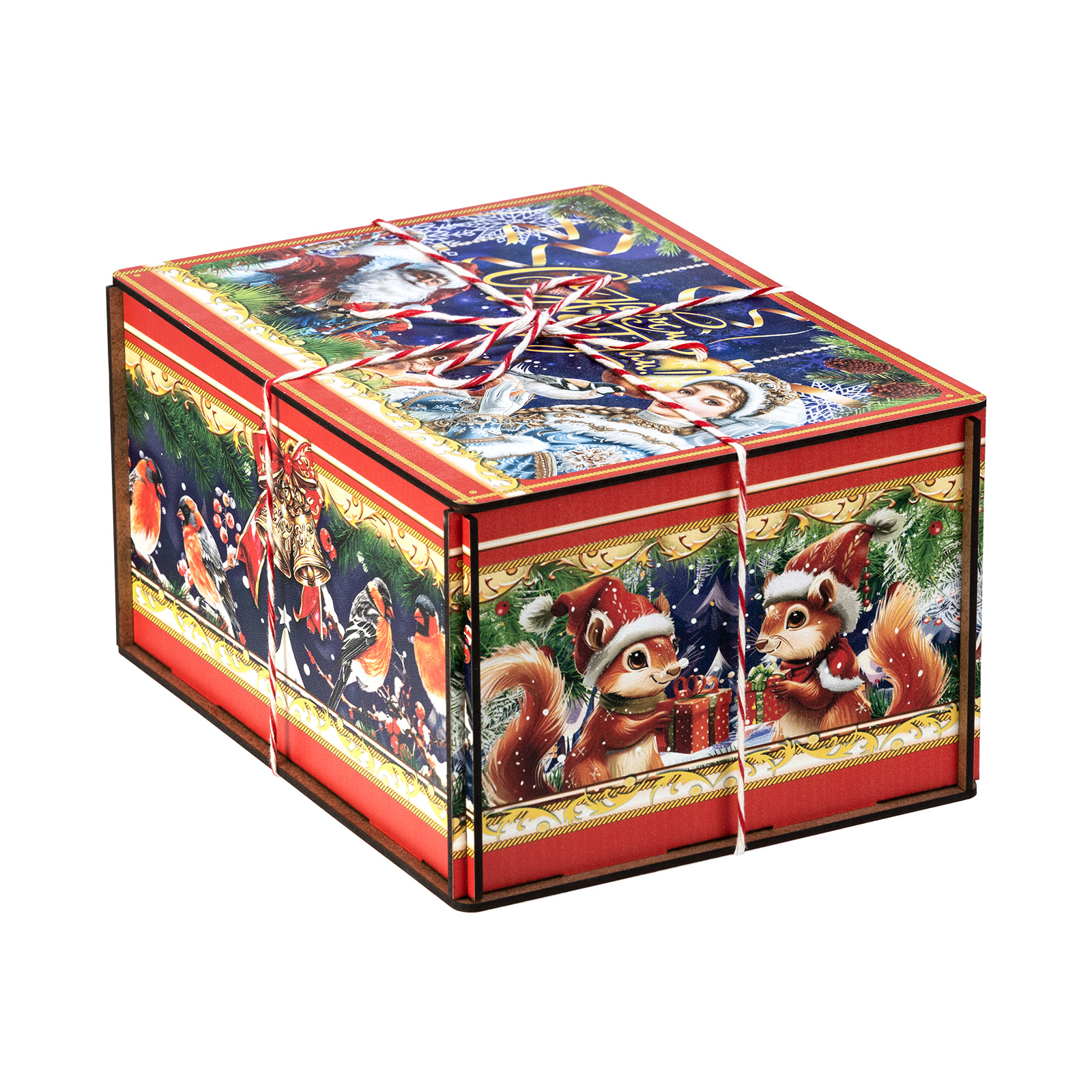 “Мелодия зимы” - это подарочный набор в деревянной упаковке, который прекрасно подойдет в качестве презента для подростка или взрослого. Это небольшой деревянный ящик, пестро украшенный со всех сторон разнообразными яркими иллюстрациями. На боковых гранях нарисованы лесные обитатели, а на крышке красуется изображение главных праздничных героев: Дедушка Мороз и Снегурочки. В состав подарка входит полтора килограмма кондитерских изделий на любой вкус, а также небольшой памятный сувенир в виде символа 2026 года - очаровательной лошадки. Благодаря такому подарку воспоминания о новогоднем торжестве останутся с вами на долгие месяцы.
