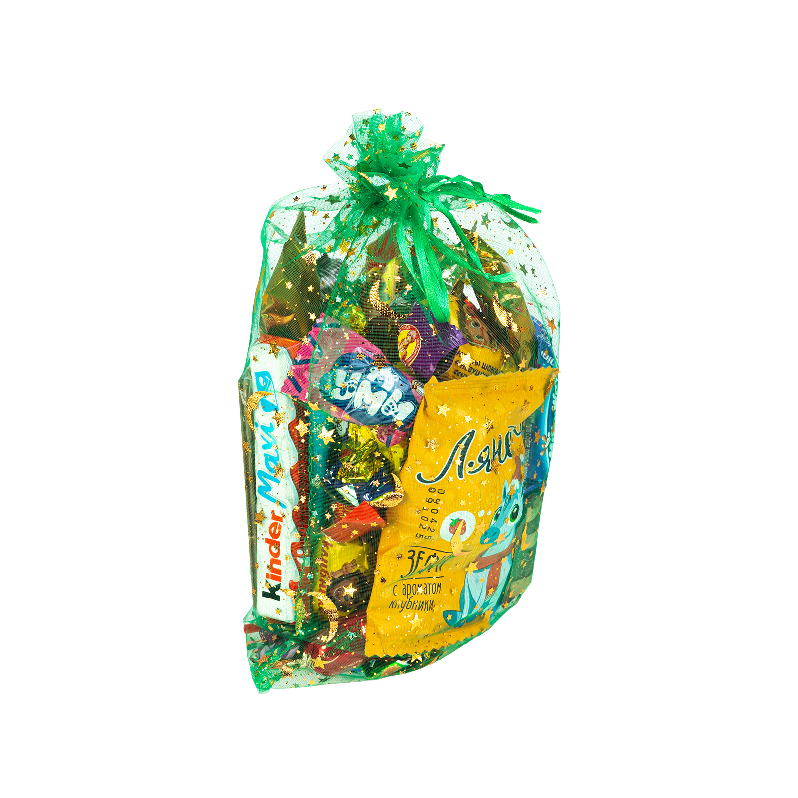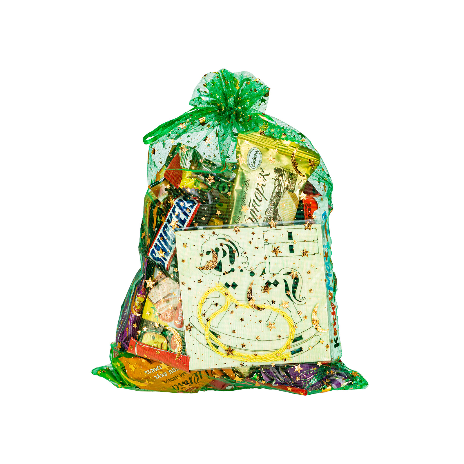 Новогодние сладкие подарки в текстильном мешочке - универсальный выбор, если речь идет о новогоднем празднике в школе или детском саду. “Лунная ночь” - это компактный бюджетный подарочный набор, упакованный в зеленый текстильный мешочек, сверху надежно перевязанный веревочкой. В состав подарка входит входит 500 грамм разнообразных кондитерских изделий на любой вкус: желе, бисквиты, батончки, шоколадные конфеты и многое другое. Также в мешочке можно найти небольшой памятный сувенир в виде символа наступающего года - очаровательной грациозной лошадки.