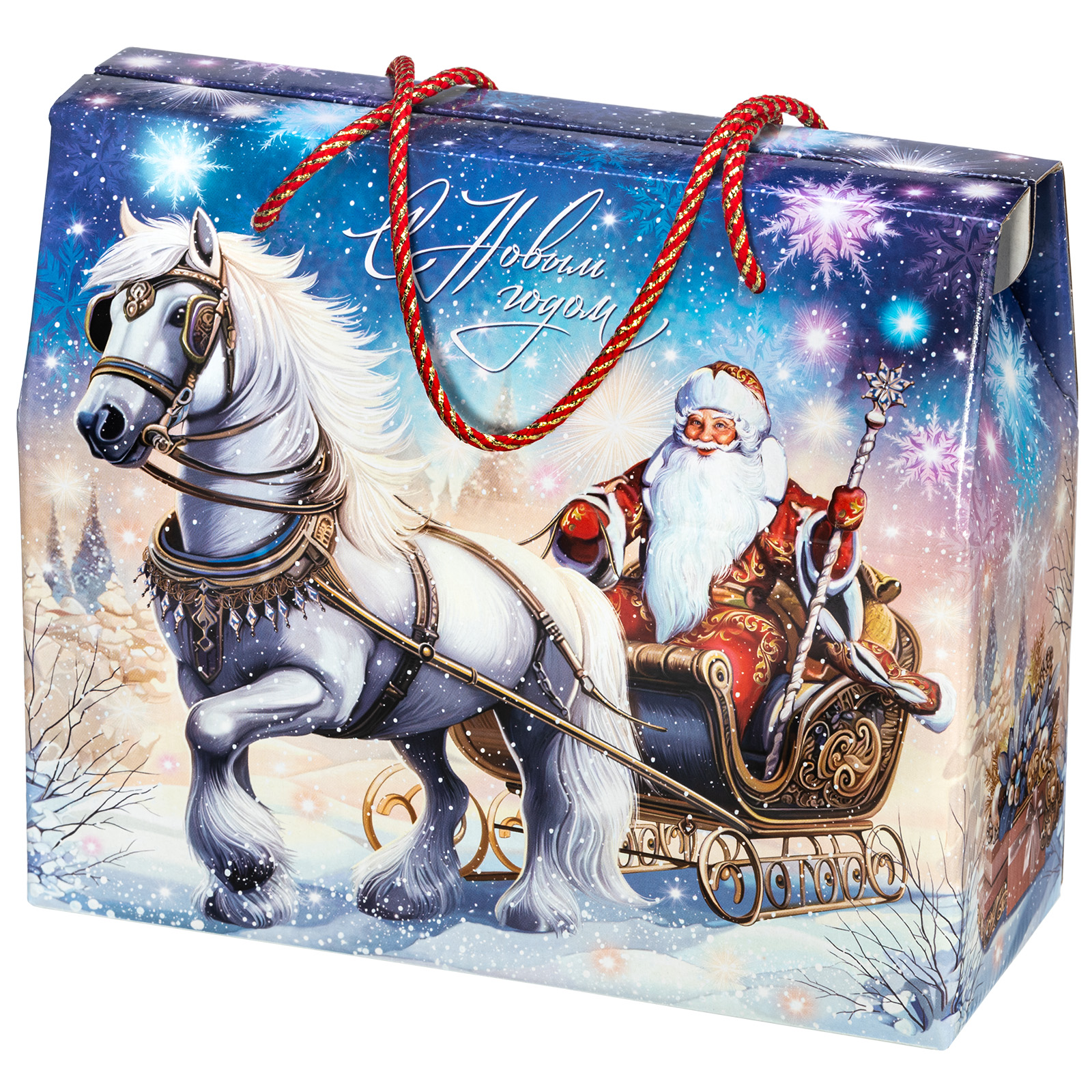 Новогодний сладкий подарок должен обладать не только замечательным вкусом сладостей, но и иметь яркую оригинальную упаковку, которую так и не терпится раскрыть! “Сумочка визит” - компактная картонная коробочка с удобной ручкой-шнурком красного цвета. Наличие ручки делает набор крайне удобным для транспортировки, что позволяет взять такой подарок в дорогу, чтобы вручить другу или родственнику из другого города. На сумочке изображен Дедушка Мороз в упряжке, а внутри этого подарка бережно хранятся отборные сладости, которые идеально подойдут к любому праздничному столу.